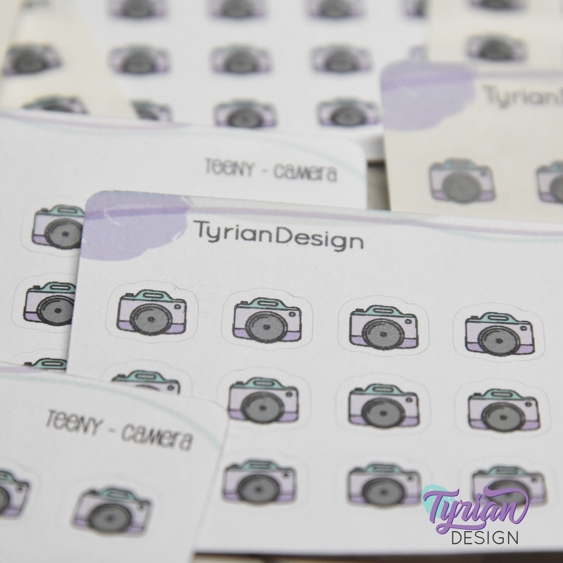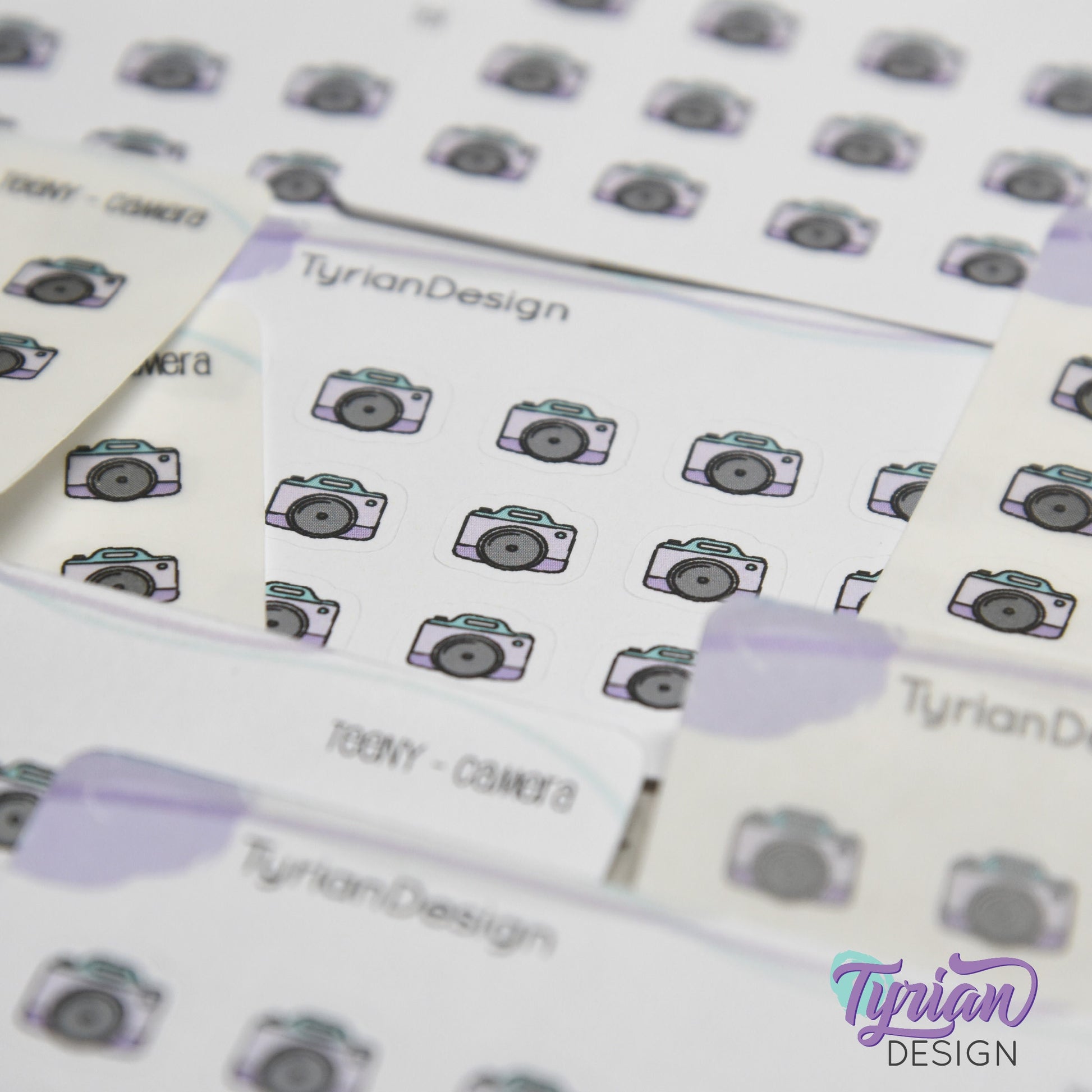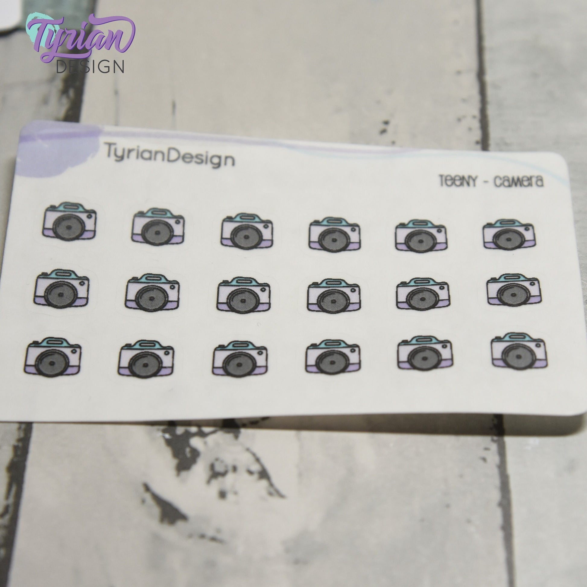 Camera Stickers | Tiny Icon Camera stickers on a mini sheet | 18 stickers | .42 x .39" each | Photo icon sticker | White or Clear Matte