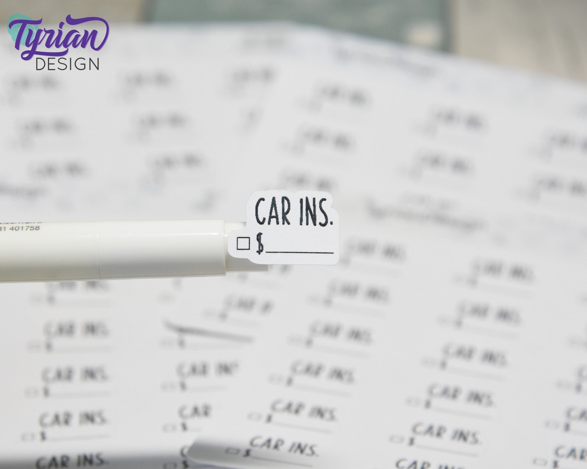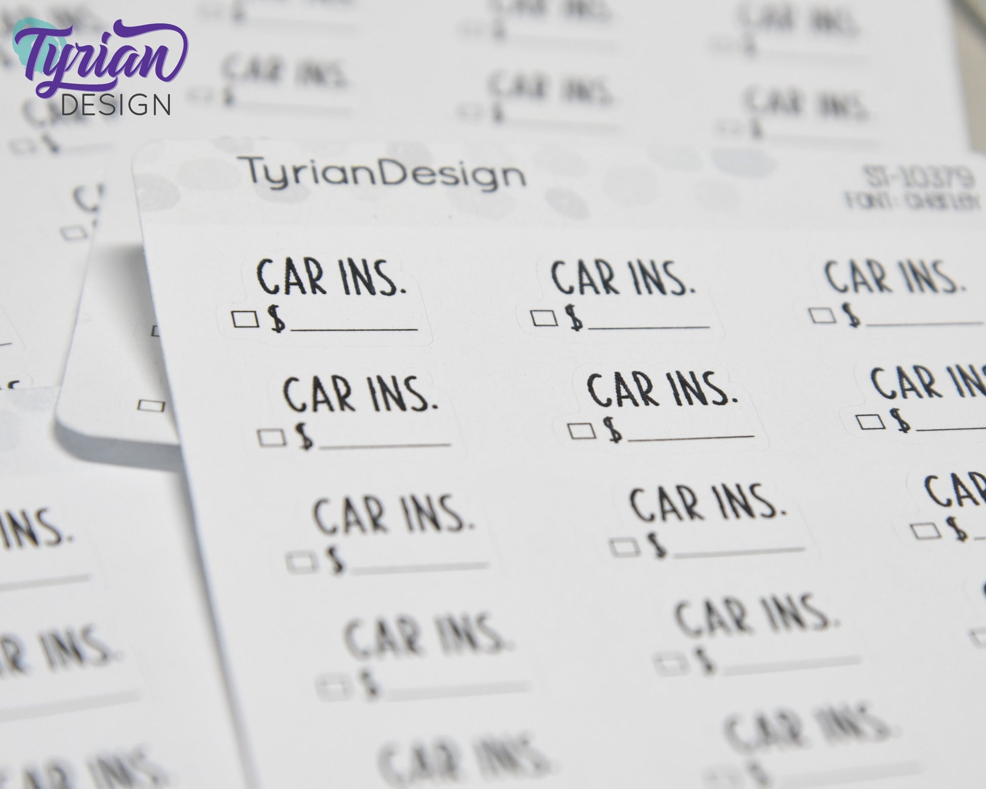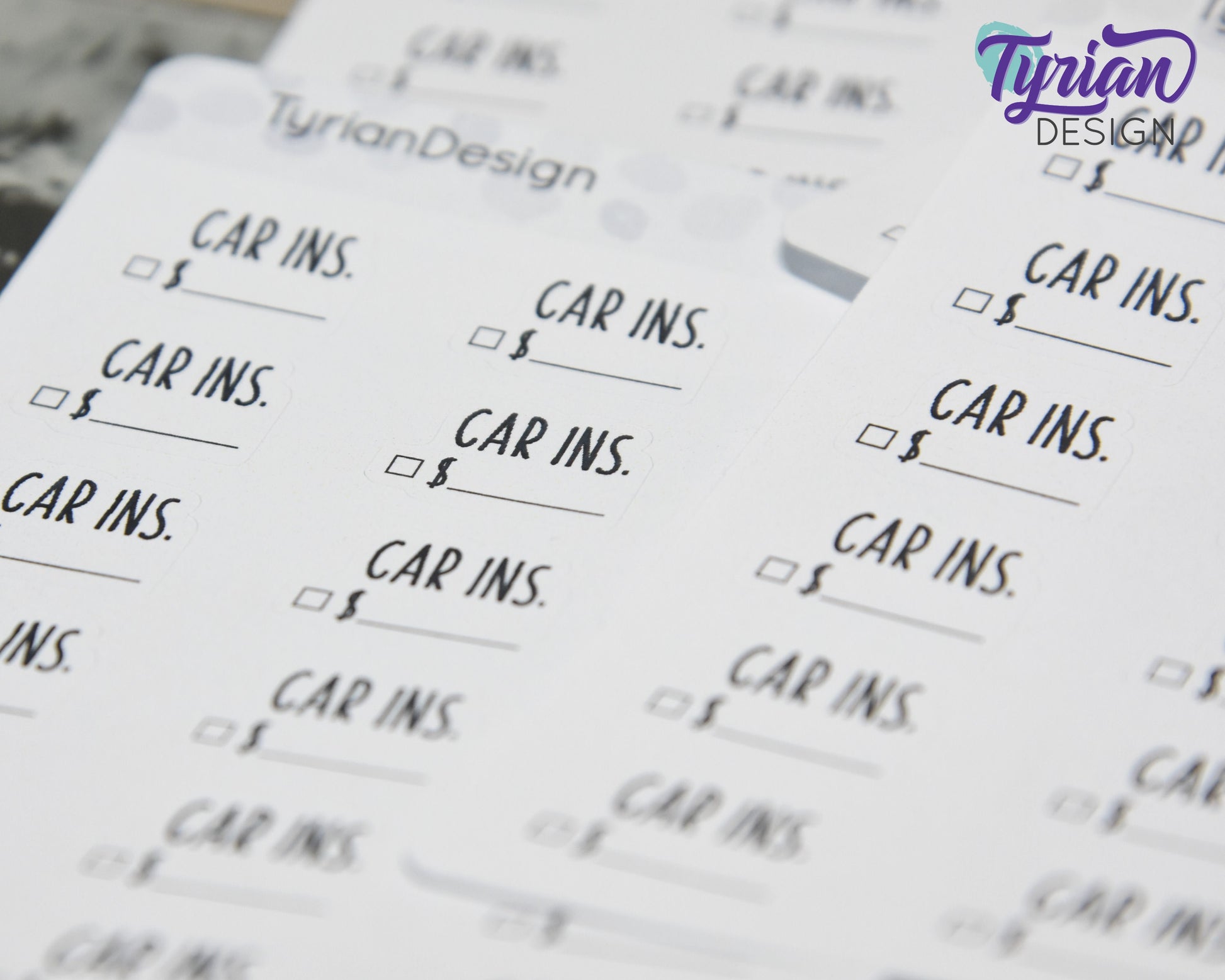 Car Insurance Stickers | Budget stickers | 18 Stickers | .78" x .54" Each | 3.5 x 4.5" Sheet | Charley Font | White or Clear