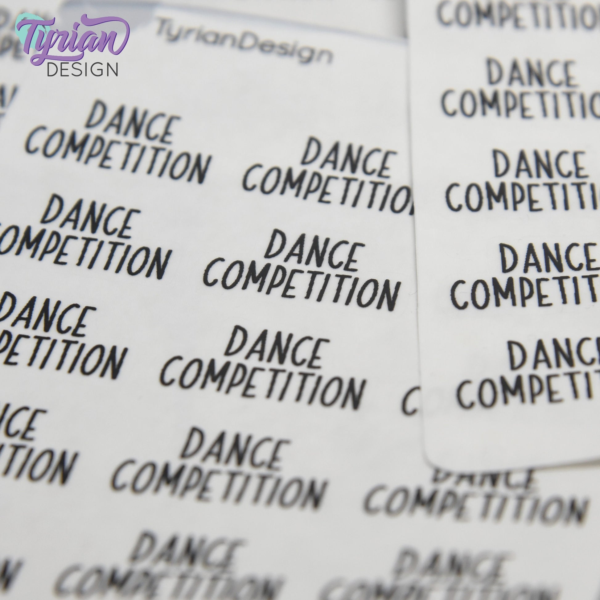 Dance Competition Stickers | 12 Stickers per sheet | 1 x .6" Sticker size | | 3.5 x 4.5" Sheet | White or Clear Matte | Font: Charley