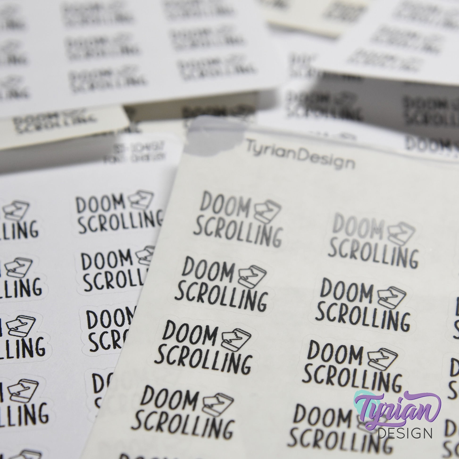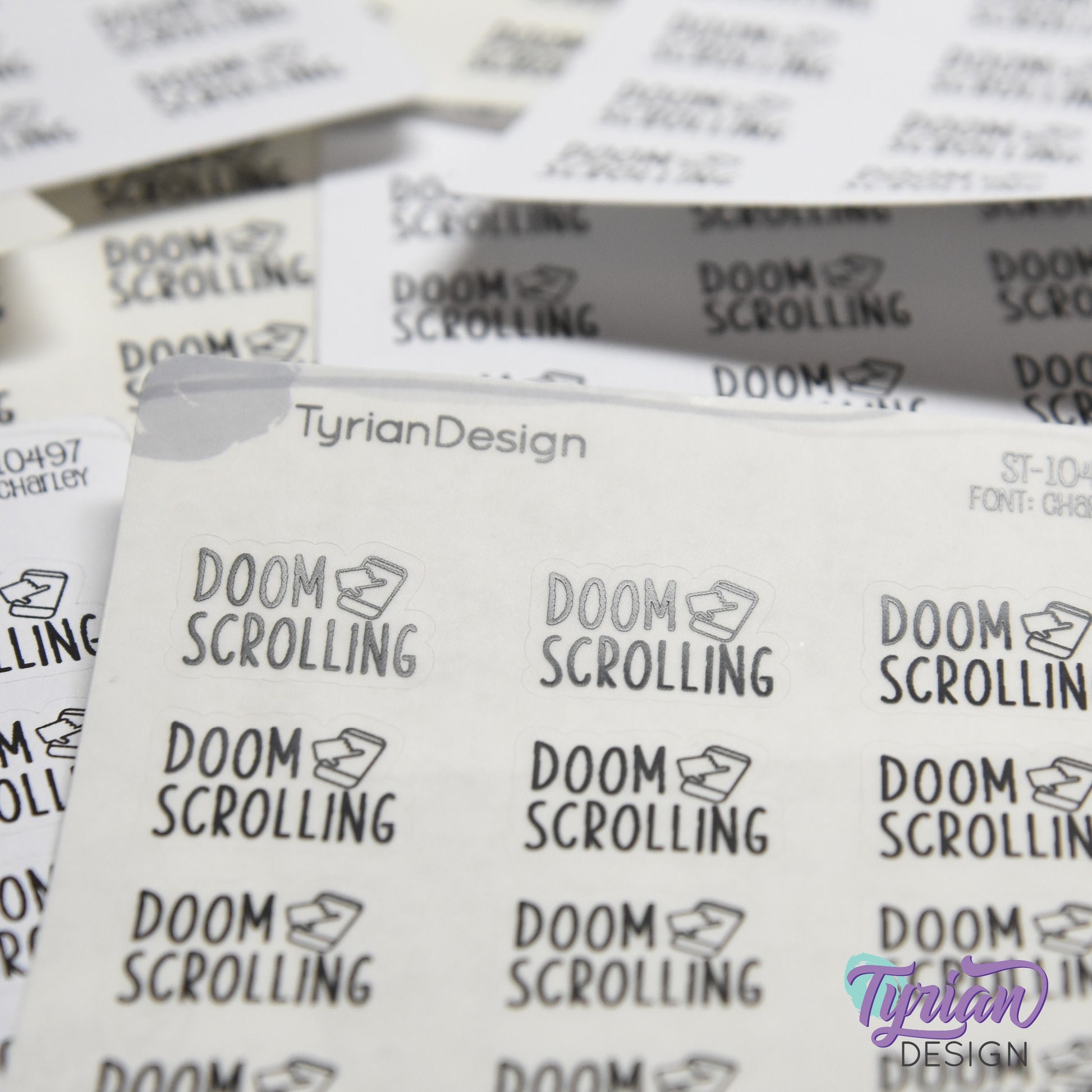 Doom Scrolling Sticker | Wasting Time Sticker | 15 Stickers | .85" x .61" Each | 3.5 x 4.5" Sheet | Charley Font | White or Clear