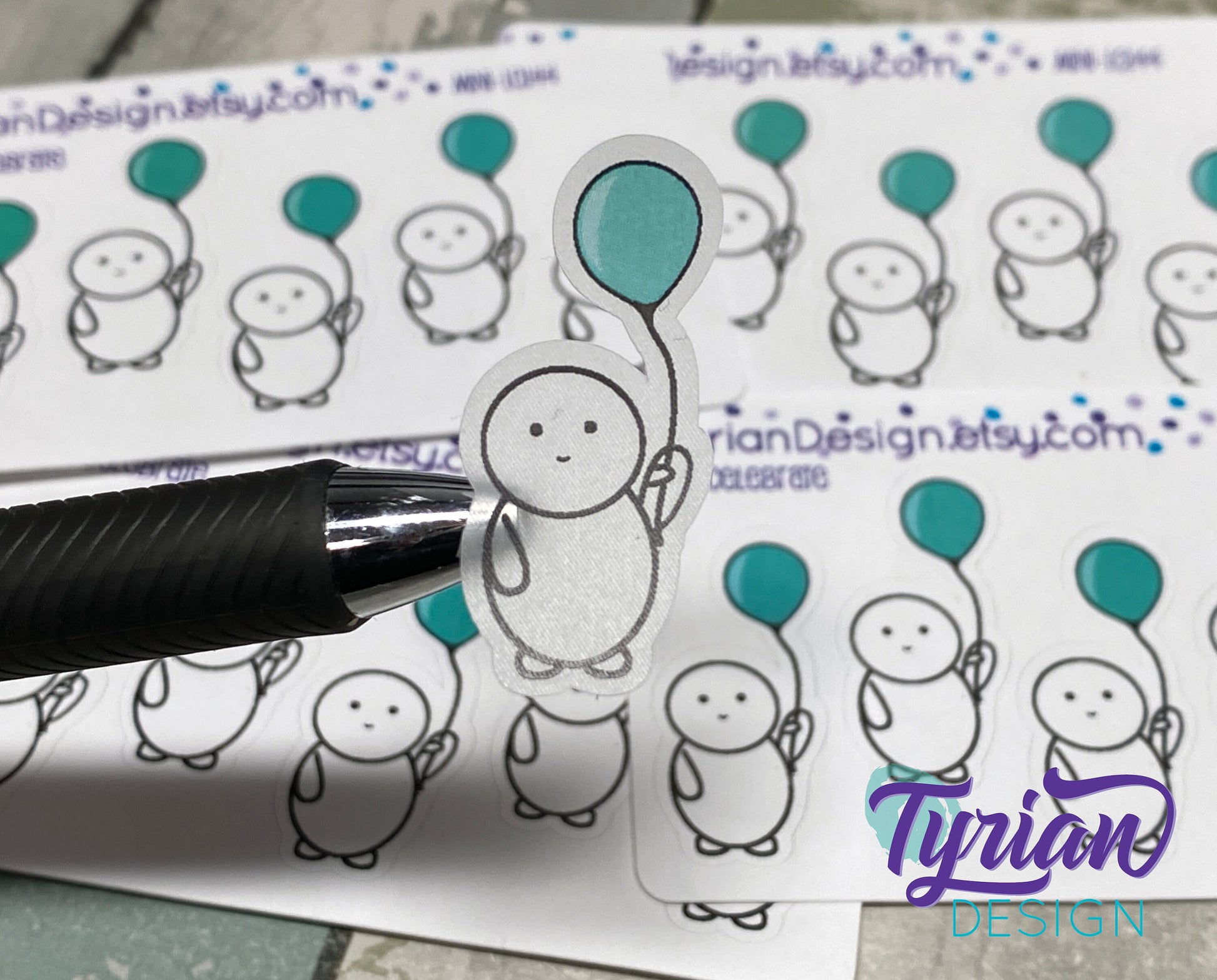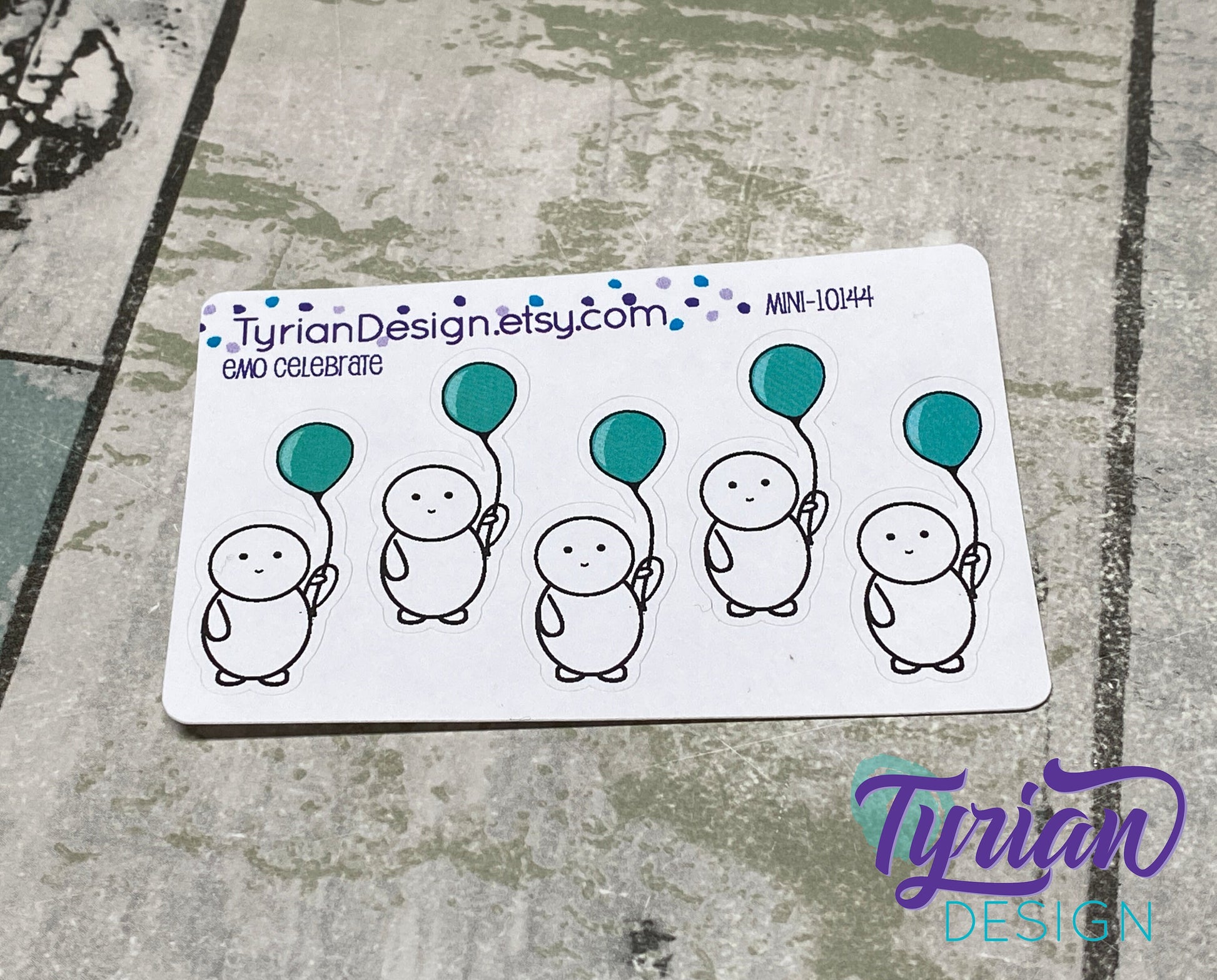 Emo Celebrate character Sticker Mini Sheet. Emoji with Turquoise Balloon.