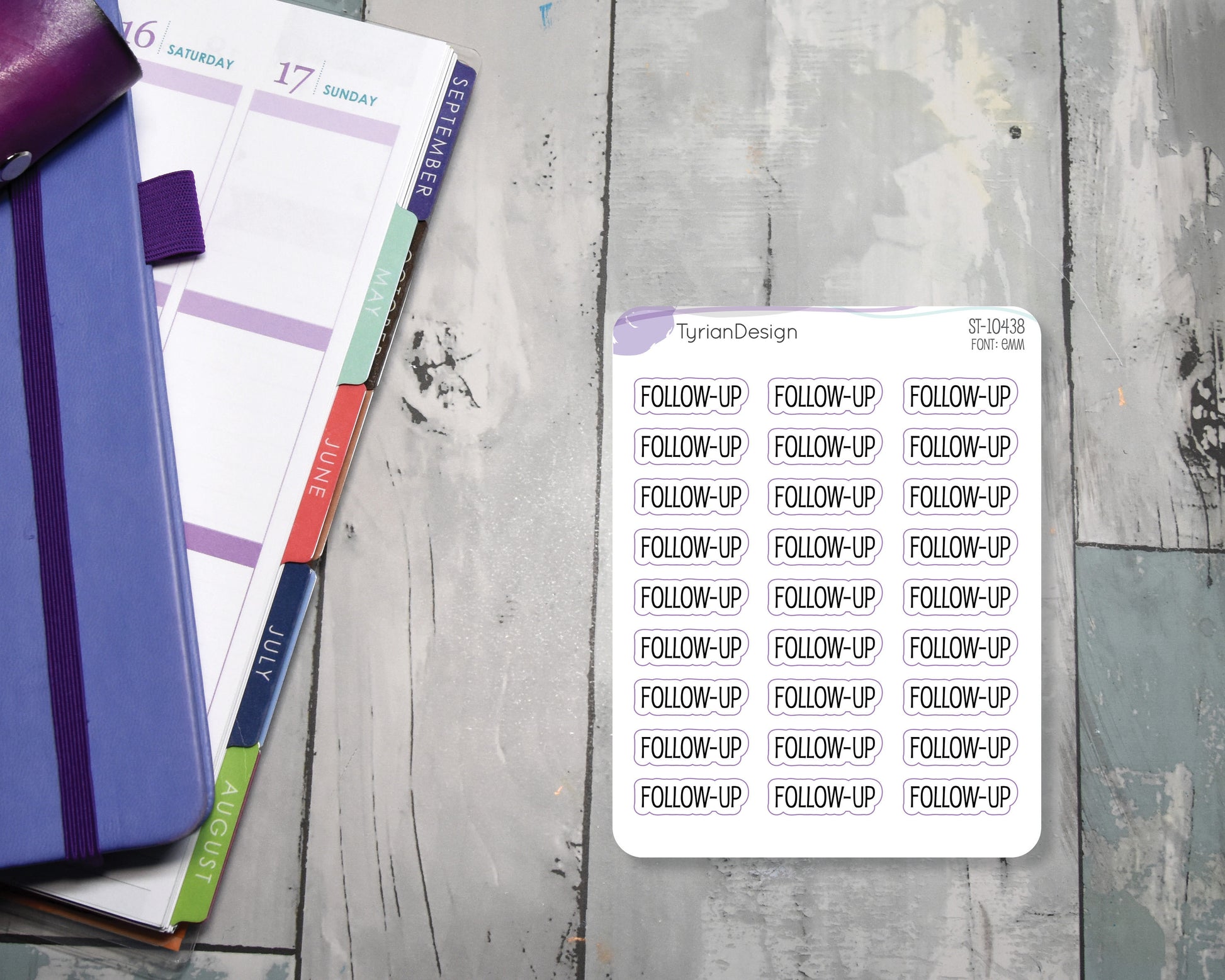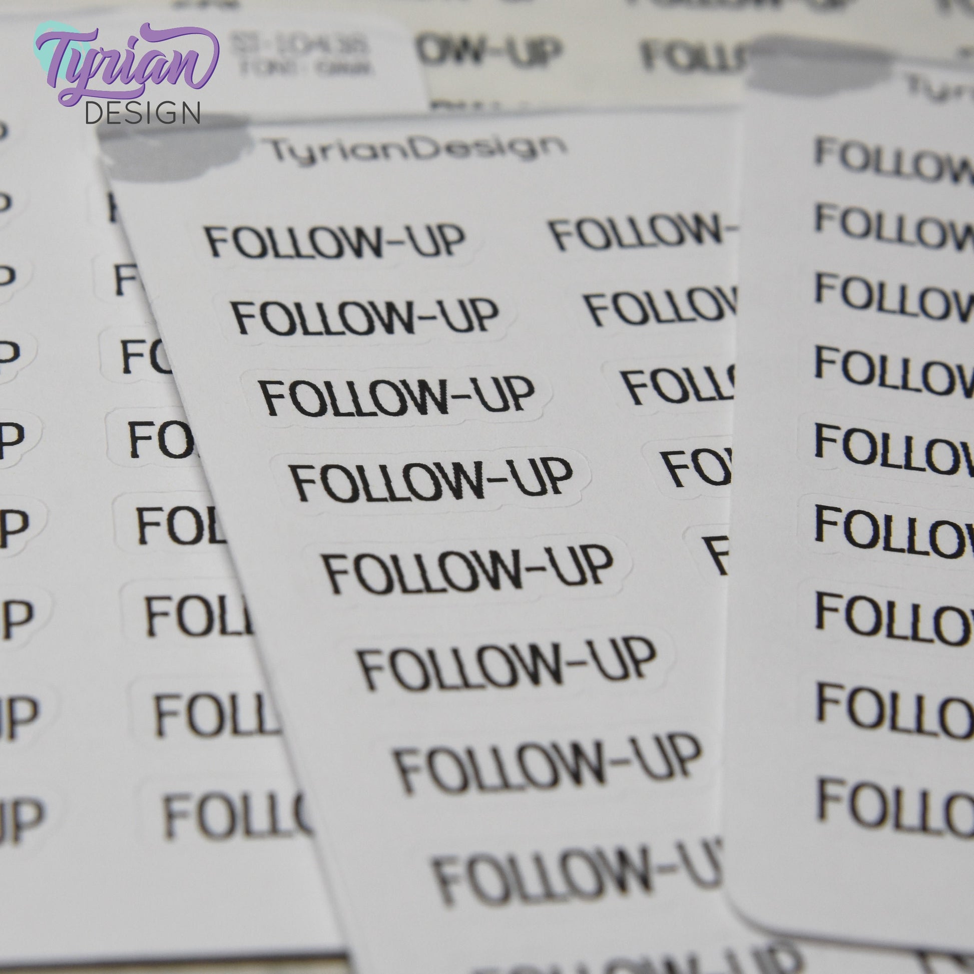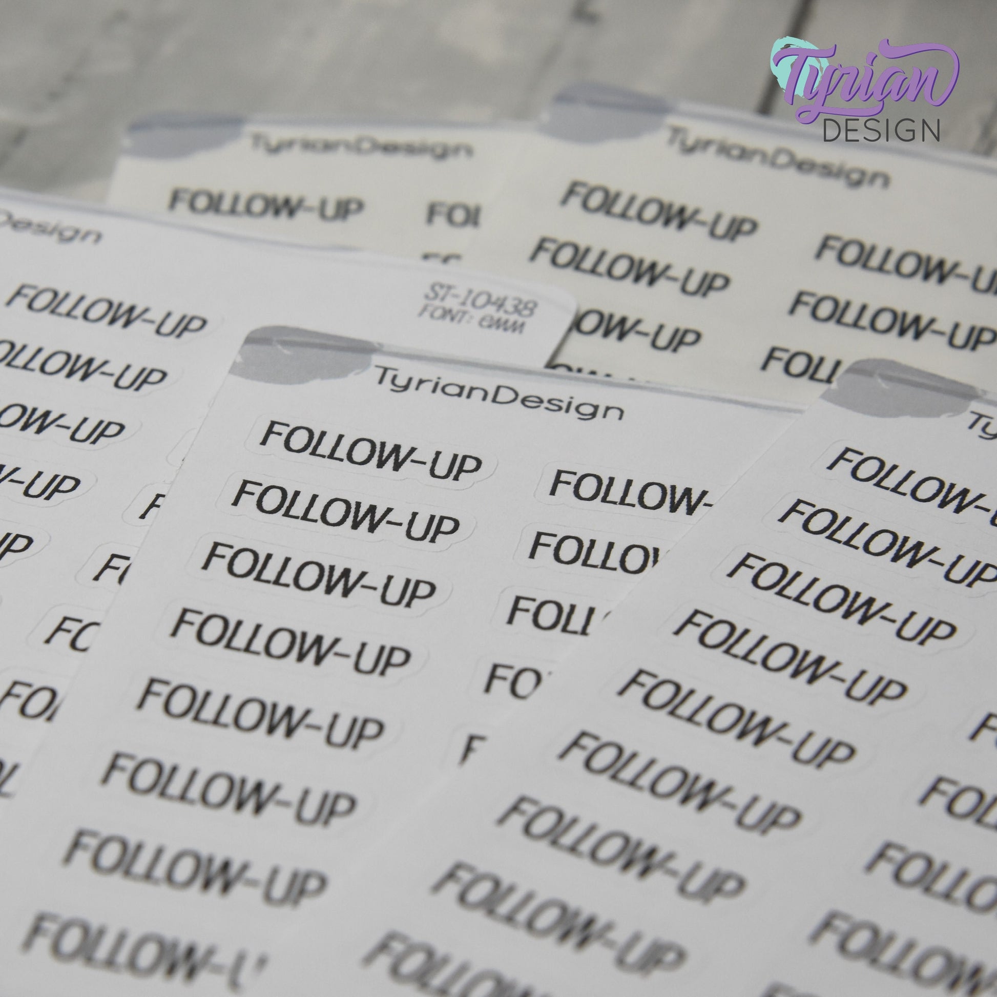 Follow-Up Sticker | Word Sticker | 27 Stickers | .92" x .3" Each | 3.5 x 4.5" Sheet | Emm Font | White or Clear