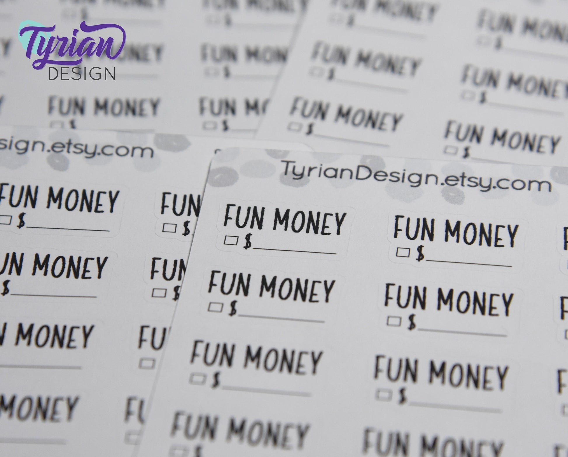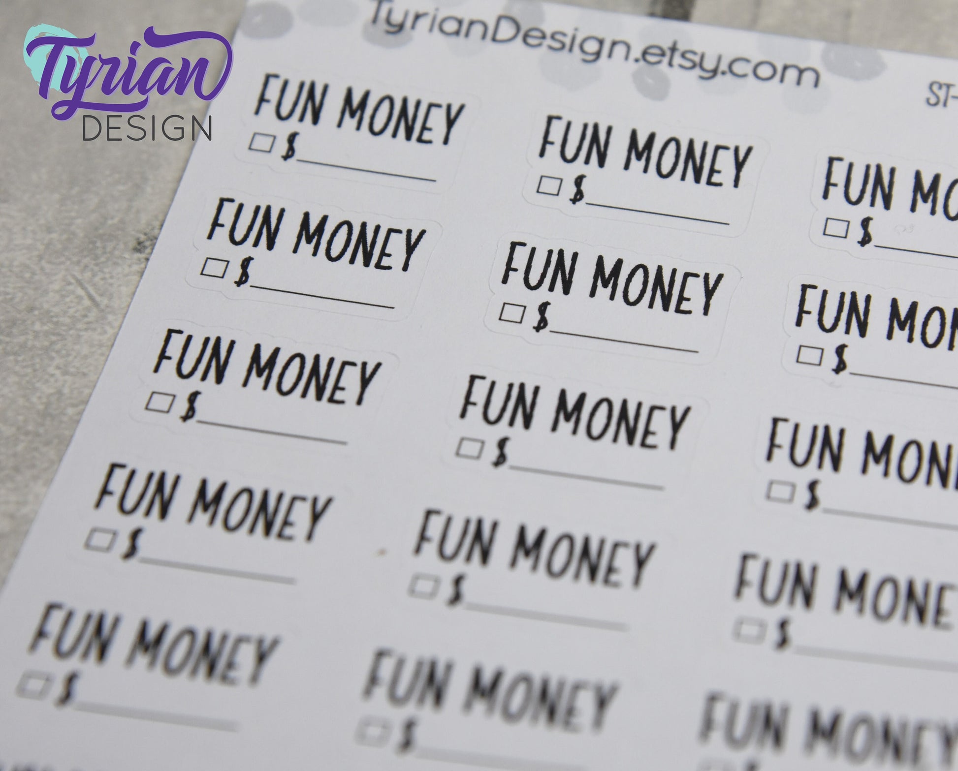 Fun Money Stickers Sheet for Planners and Journals. Black Type, clear or white matte stickers - Fun money spending Budget Stickers