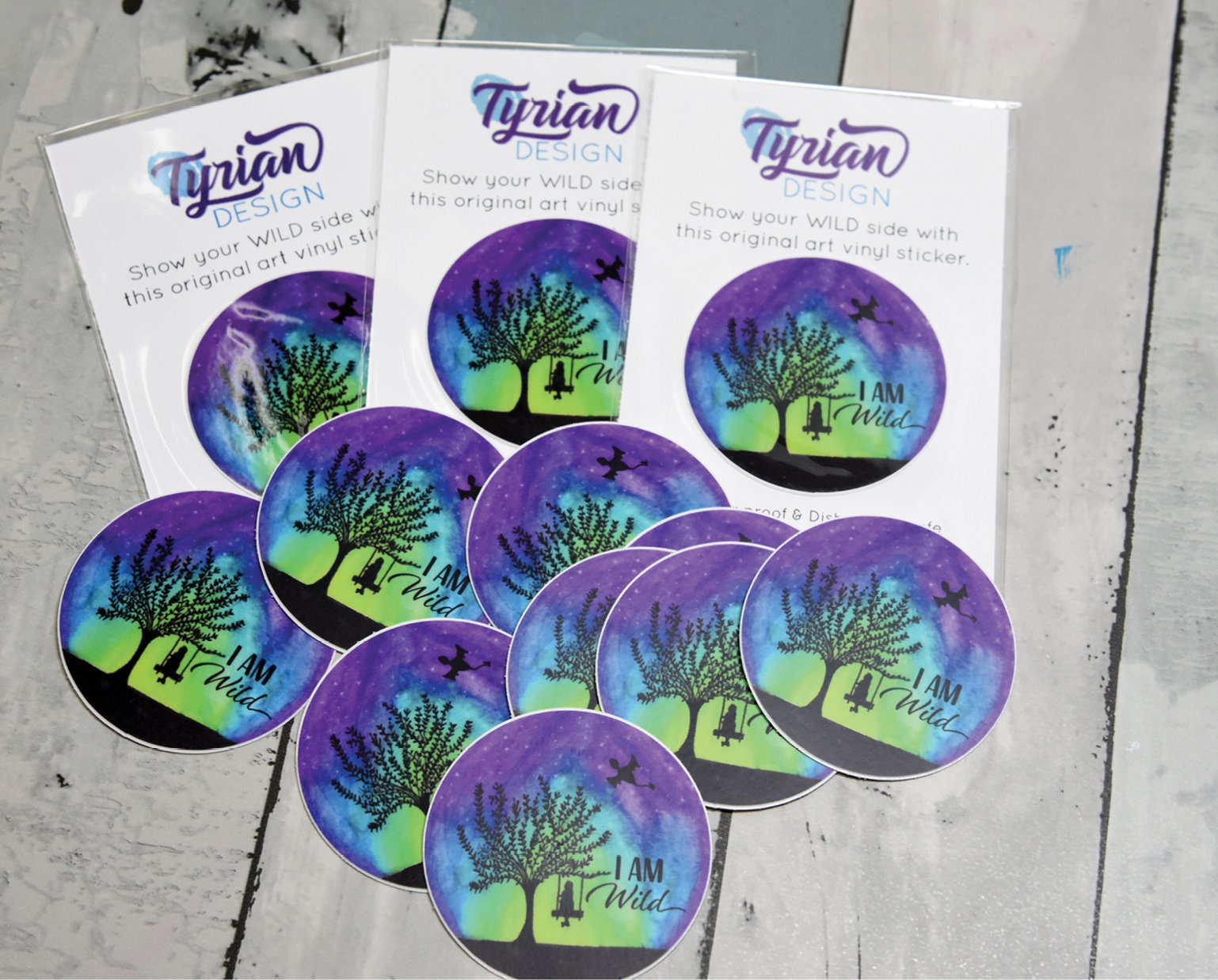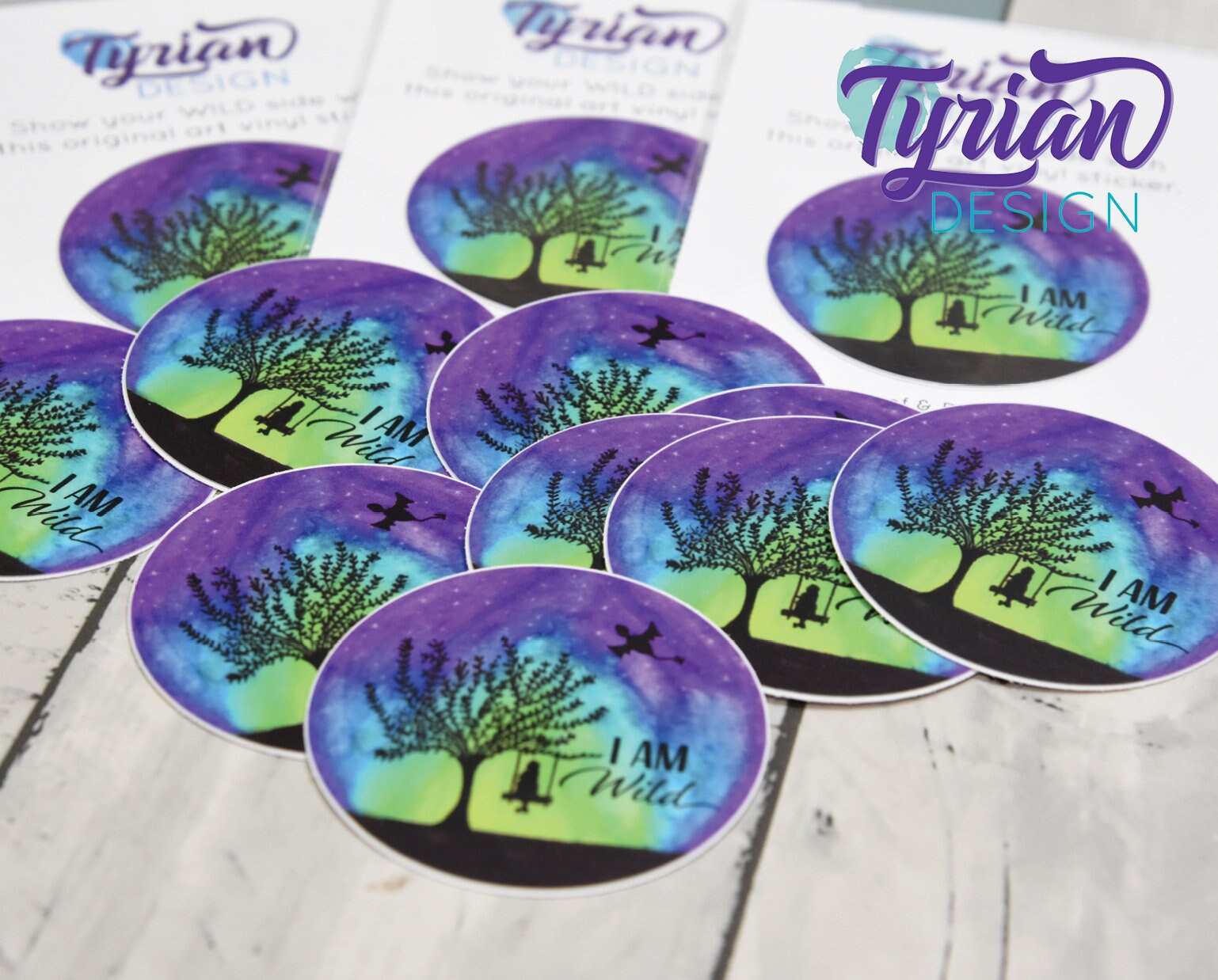 I am Wild Vinyl Sticker, Tree swing with dragon in the sky high quality weather proof vinyl. 2 inches round. Great for journals, laptops, phones, notebooks and more.
