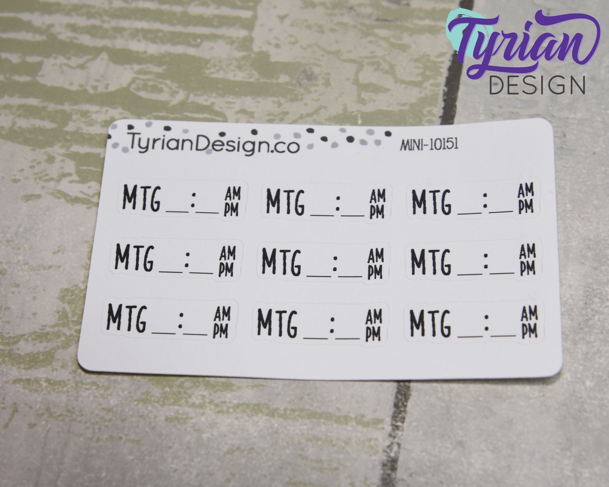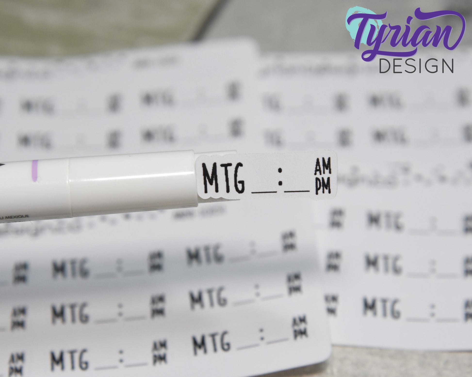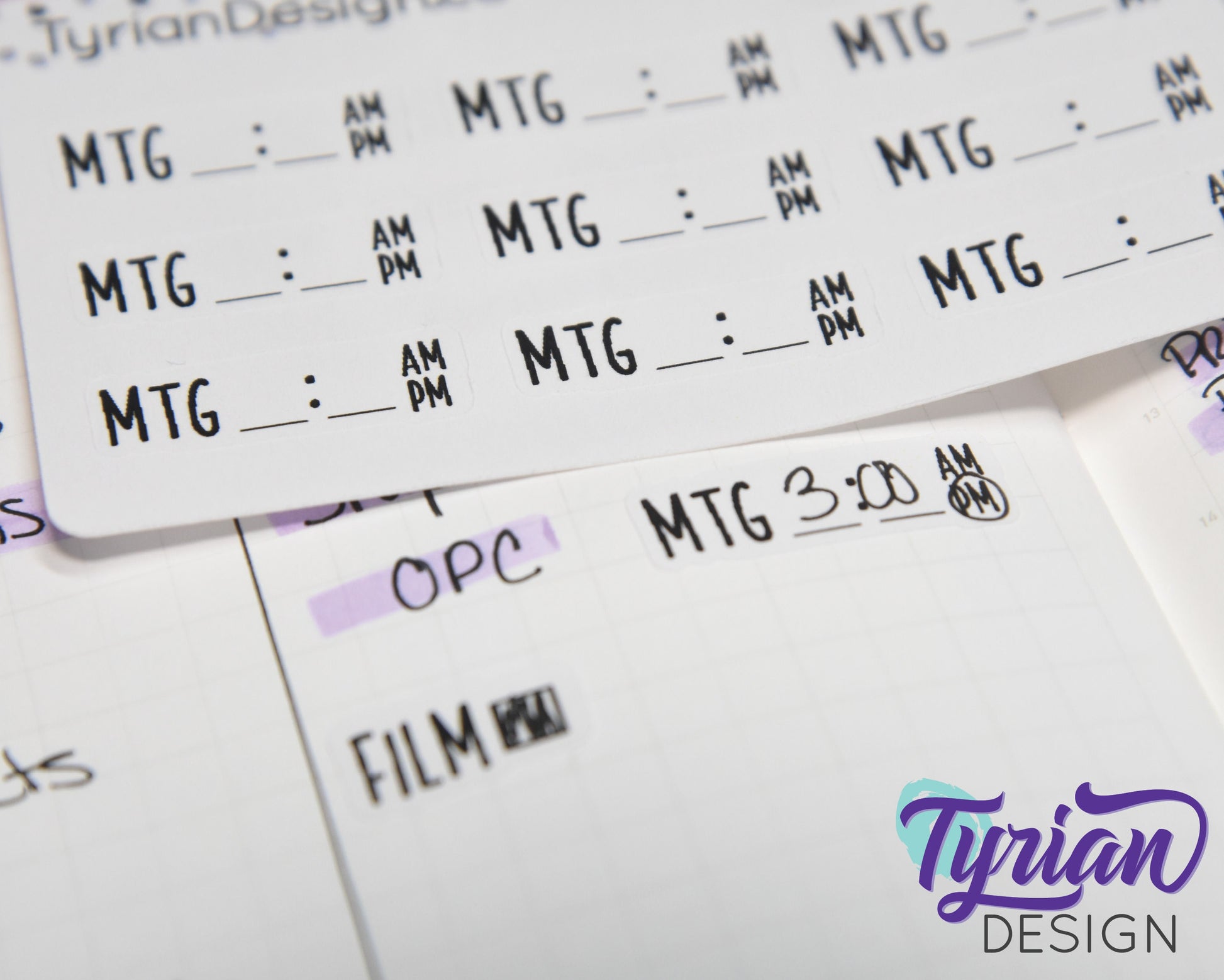 Meeting Time Stickers Mini Sheet for Planners and Journals. Black Type, clear or white matte stickers - Meeting with Time space am pm