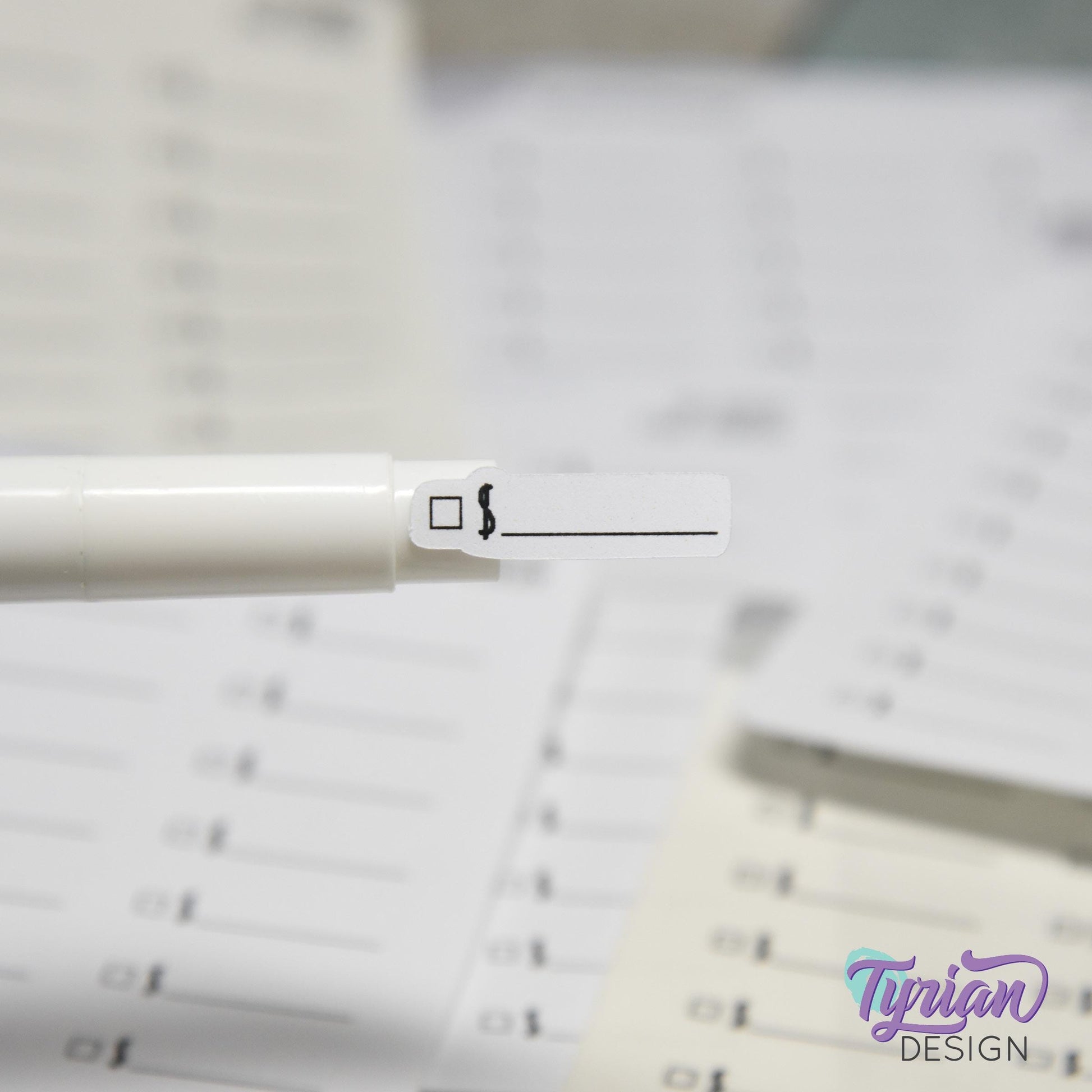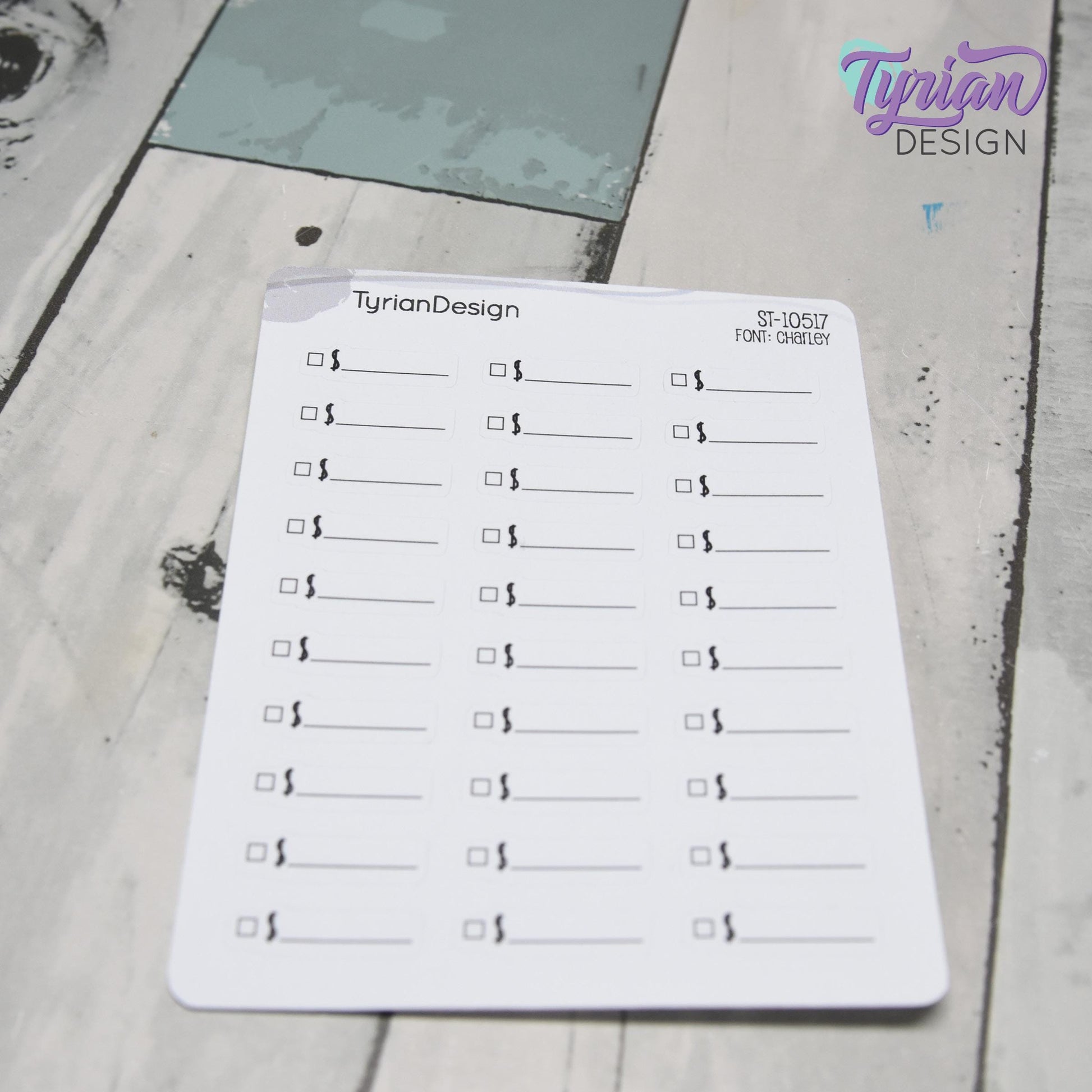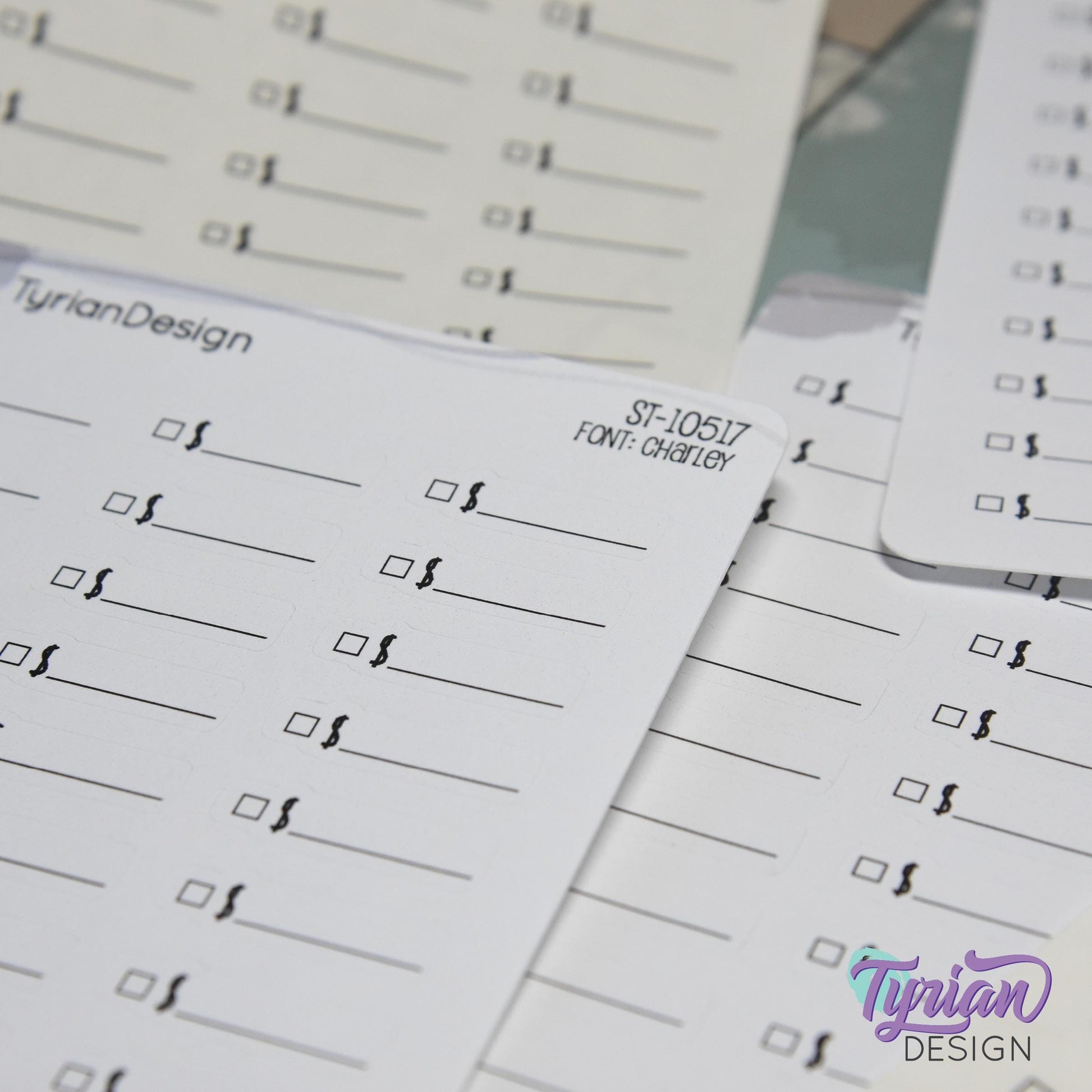 Payment Sticker | Tracking stickers | Budget Sticker | 30 Stickers | .91" x .28" Each | 3.5 x 4.5" Sheet | Charley Font | White or Clear