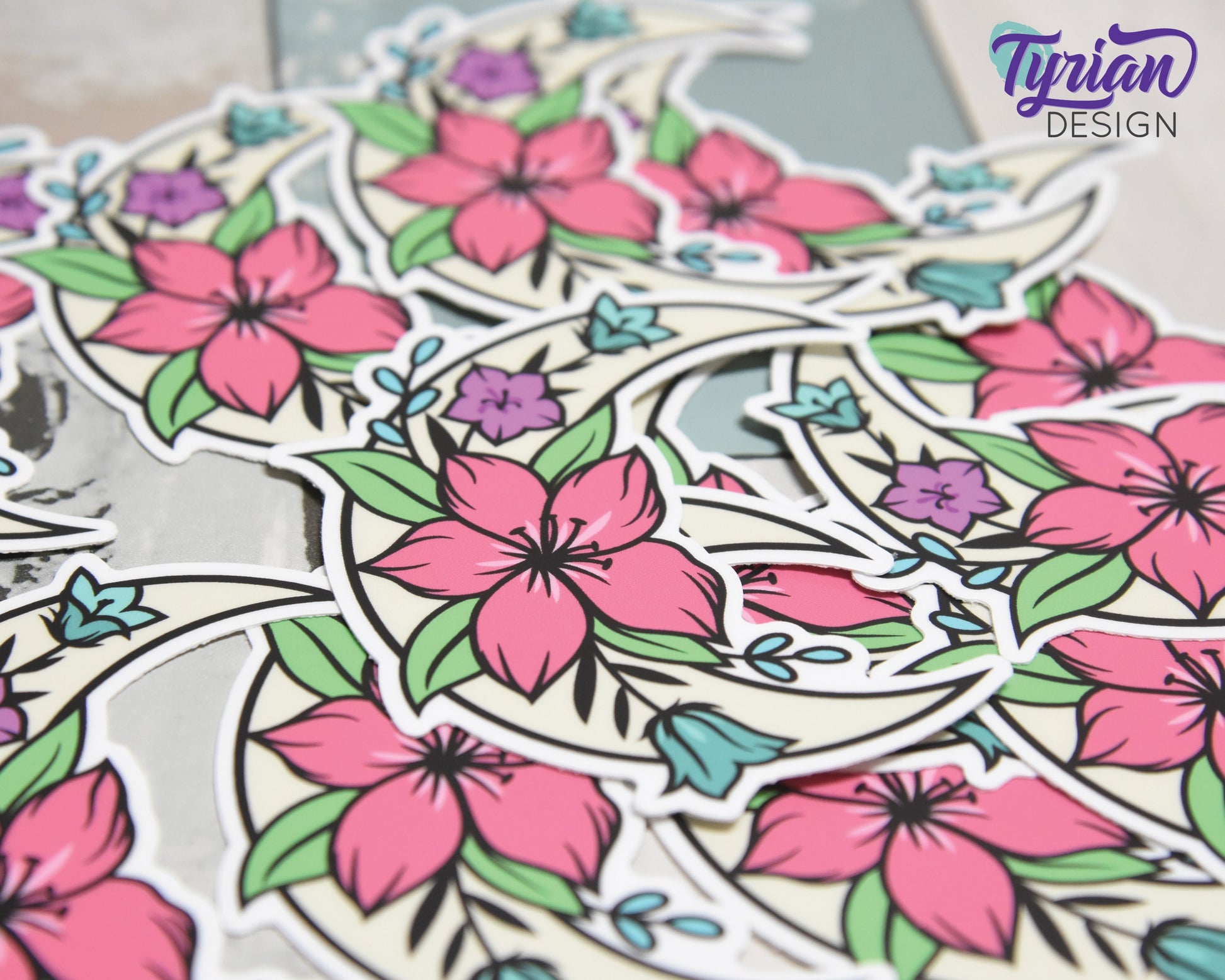Spring Flower Moon Vinyl Sticker | high quality weather proof vinyl | 2.5 x 3" | Moon with Flowers Bright Spring Colors