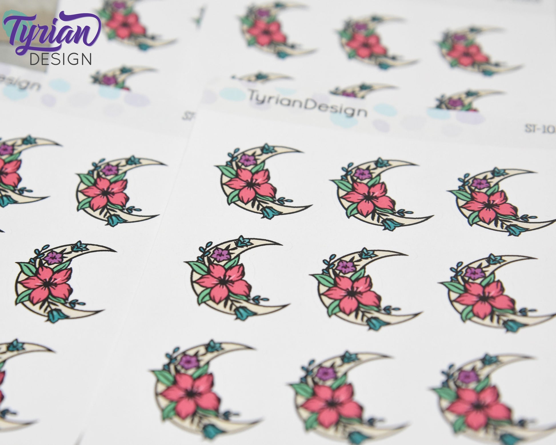 Spring Moon Stickers | Moon with Flowers | 9 Stickers per sheet | 1 x 1" Sticker size | | 3.5 x 4.5" Sheet | White or Clear Matte
